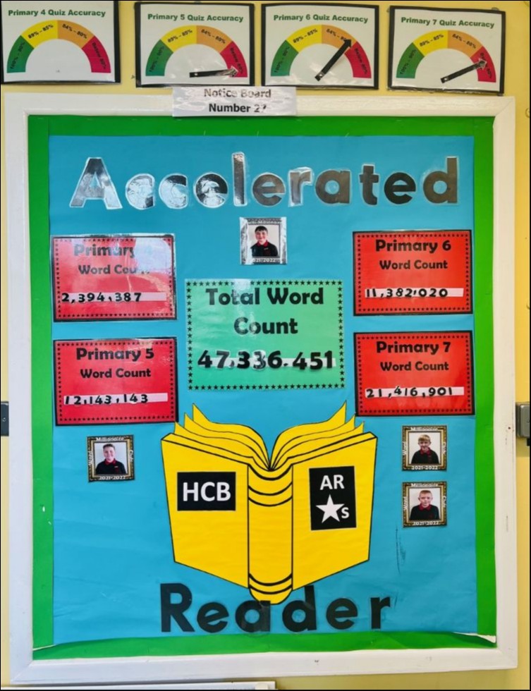 Accelerated Reader has been operating in Holy Cross Boys’ for many years and is a programme that we feel deserves our heavy financial investment each year. Accelerated Reader is a guided reading intervention used to supplement regular reading lessons within our P4 – P7 classes. Its aim is to improve students' reading skills through reading practice and quizzes on the books students read. The boys are rewarded regularly for their word counts and quiz accuracy and celebrated on our Accelerated Reader display wall for the rest of the school to see.